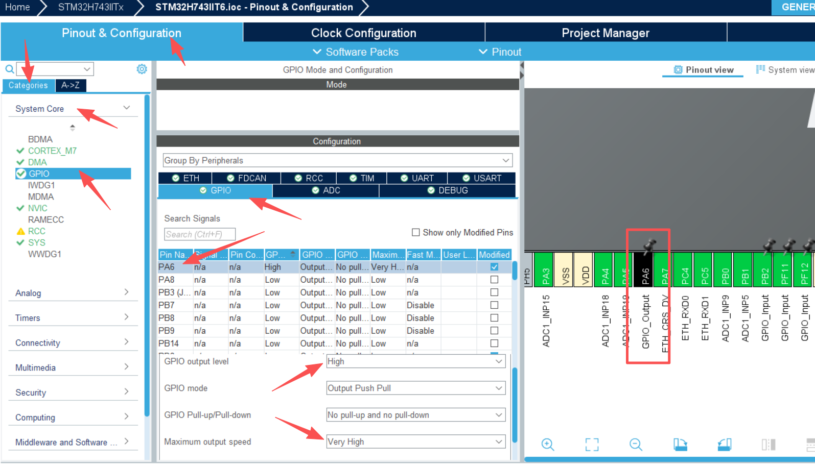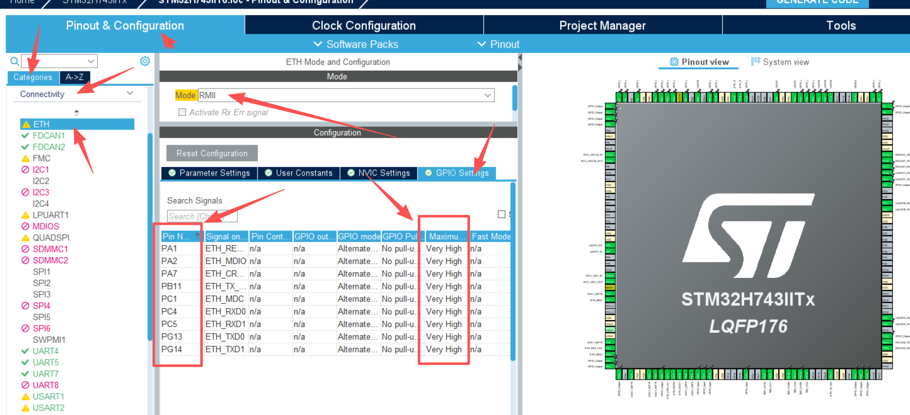 3.7、根据硬件选择Lwip的引脚,如果自动配置的引脚不是自己设置的要改成和硬件匹配的引脚“不是说所有的引脚都可以用,只有个别引脚有替换项,单片机不是FPGA不能做到所有的IO通用”,注意要把所有的IO改成最高频率,在这个页面能直接改,点击一下,下面会弹出配置界面