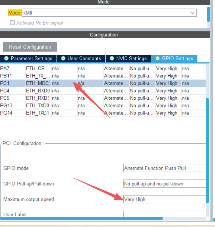 3.6、选择phy的外部复位引脚,低电平复位,默认设为高电平,开关速度调整为最高