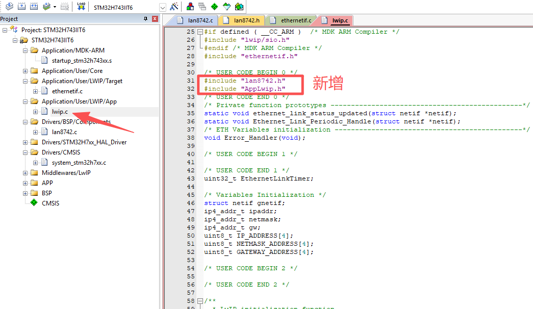 6.4、打开代码“Lwip.c”,注意“AppLwip.h”这个是为了TCP两种模式和UDP通讯准备的,也为了调用gpio.h,因为用到了复位引脚,要在Lwip初始化前复位管脚