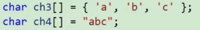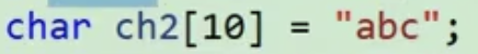 这个代码也是定义了一个char类型的数组,但是是使用双引号的,它里面存放的就是a, b, c, 之后的字符便被初始化为零