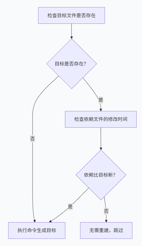 3> 什么都没修改后构建:什么都不做那么其实,看到这我相信聪明的你一定能想明白了,也就是我们的依赖关系在此处是大有作为的,有了它,我们就不用傻傻的因为一个文件的改动,而动了所有的文件,我们只会根据我们的依赖项,去针对性的处理我们的中间操作,当然此处的文件时间戳检查实际是由我们的make指令来实现的,没事,我们马上就讲。