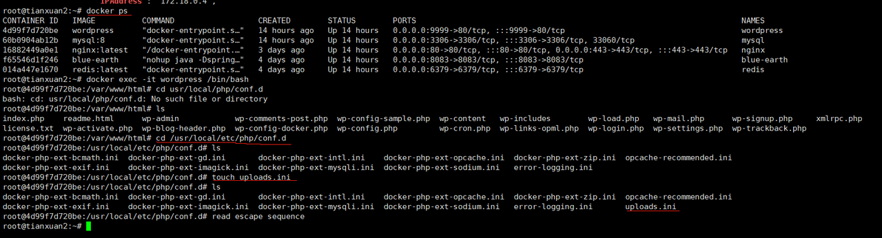 这是我服务器中 docker 内运行的容器状态,由于已经全部配置过了,所以会显示这些。nginx 和 mysql 是我们后面需要的容器,在这一步只需要看到 wordpress 有显示就可以了。