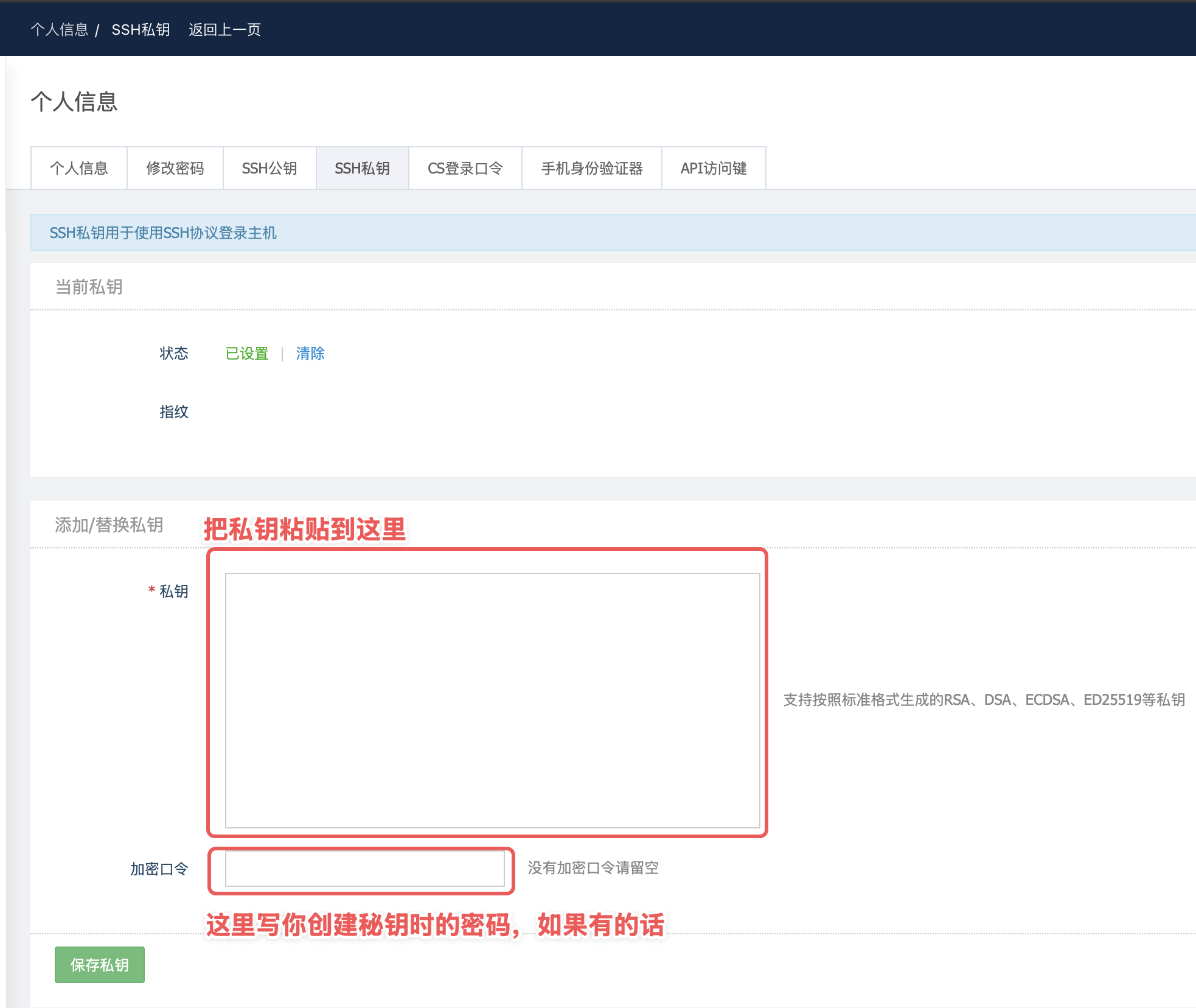 - 这里的密码是我们生成秘钥时候的密码哦,别填错了。我感觉这一步能劝退不少人!!