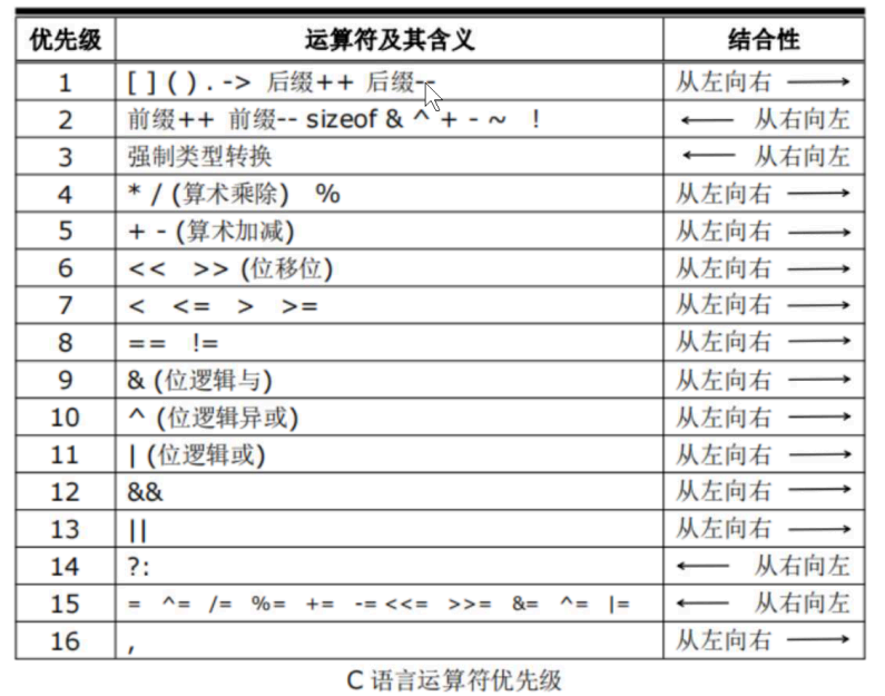 | 1 | 括号、下标、成员访问 | ()、[]、.、-> | 从左向右 |