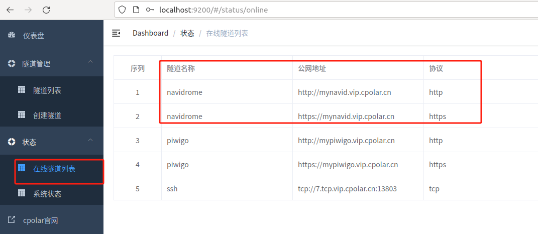 创建成功后,打开左侧在线隧道列表,可以看到刚刚通过创建隧道生成了两个公网地址,接下来就可以在其他电脑或手机平板(异地)上,使用任意一个地址在浏览器中访问即可。