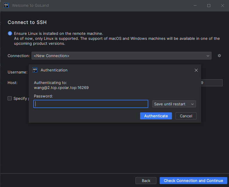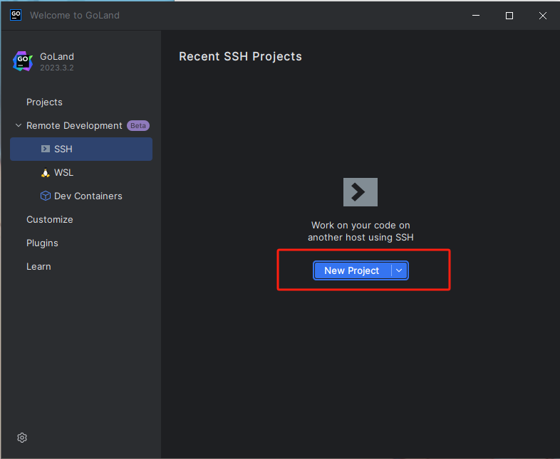 在GoLand中点击New Project,填写Username和Host(Username指服务器端用户名,Host为刚才获取的服务器本地IP地址)