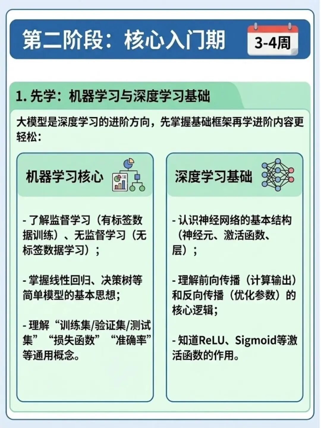核心目标:夯实机器学习/深度学习基础,攻克Transformer架构——这是所有现代大模型(如ChatGPT、文心一言)的核心基石,也是小白和程序员转型的“关键突破口”。