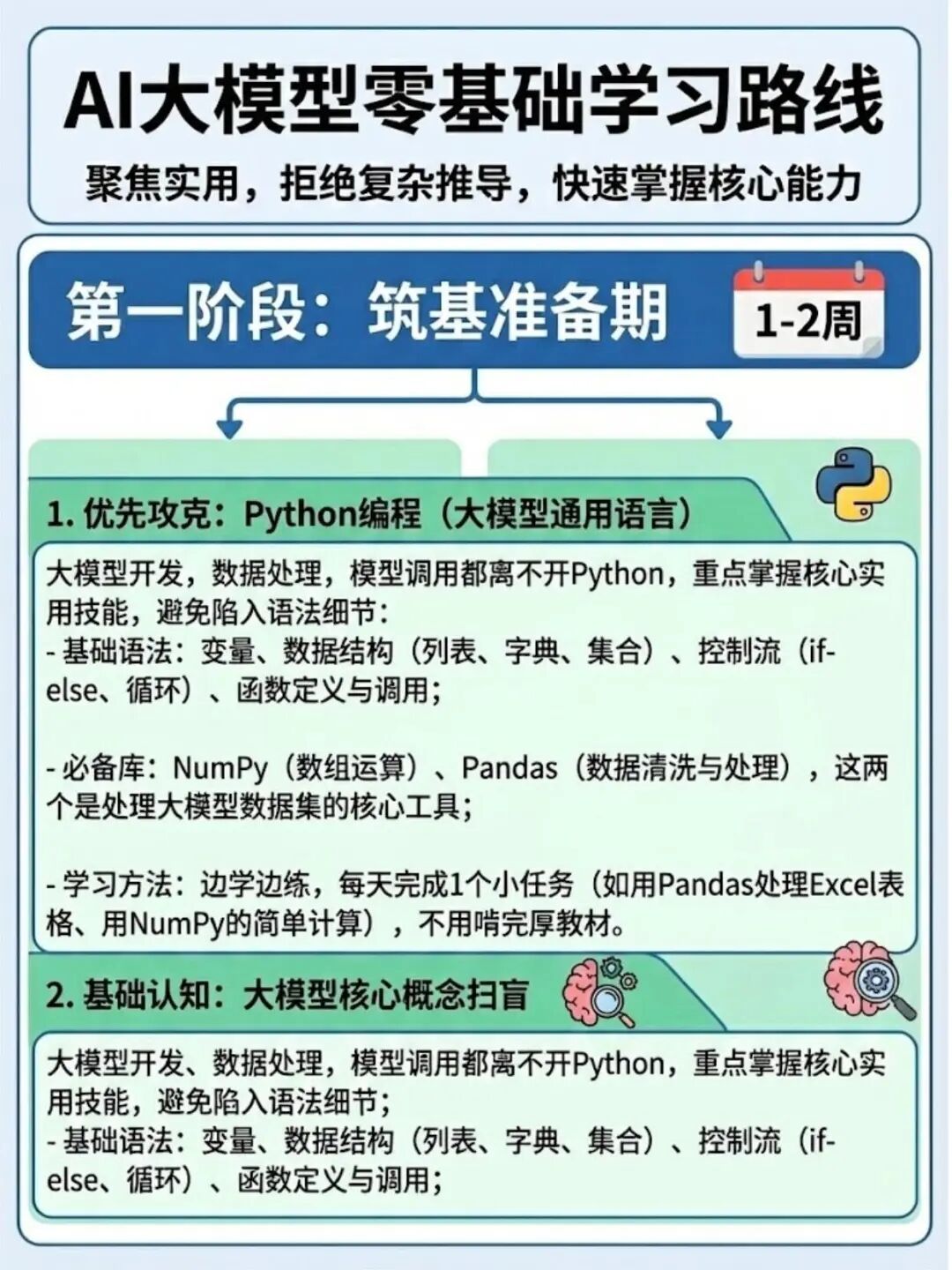 核心目标:搞定Python工具+吃透大模型基础概念,不用追求“精通”,够用就好,快速建立入门认知。