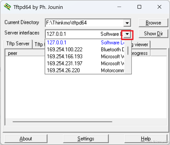 ② 调整Tftpd64的Server interfaces,选择在cloud中双向建立的本机网卡