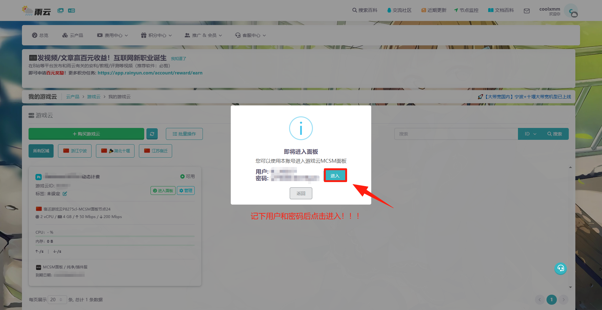 7.记下用户和密码后点击“进入”