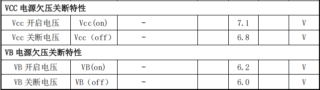 较低的欠压锁定(UVLO)阈值(V1.1版本修改),迟滞约0.3V,有助于在电压波动时稳定工作。 - VB开启/关断电压:6.2V / 6.0V(典型)