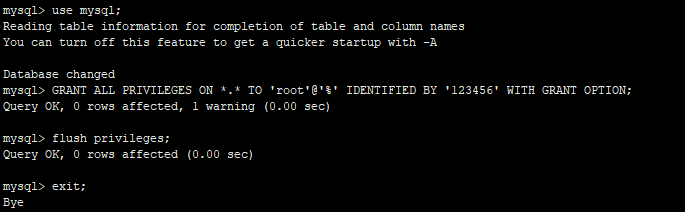 GRANT ALL PRIVILEGES ON *.* TO 'root'@'%' IDENTIFIED BY '123456' WITH GRANT OPTION;