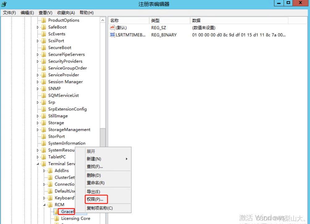 1.选择“HKEY_LOCAL_MACHINESYSTEMCurrentControlSetControlTerminal ServerRCMGracePeriod”,选中 GracePeriod 然后右键 点击 权限