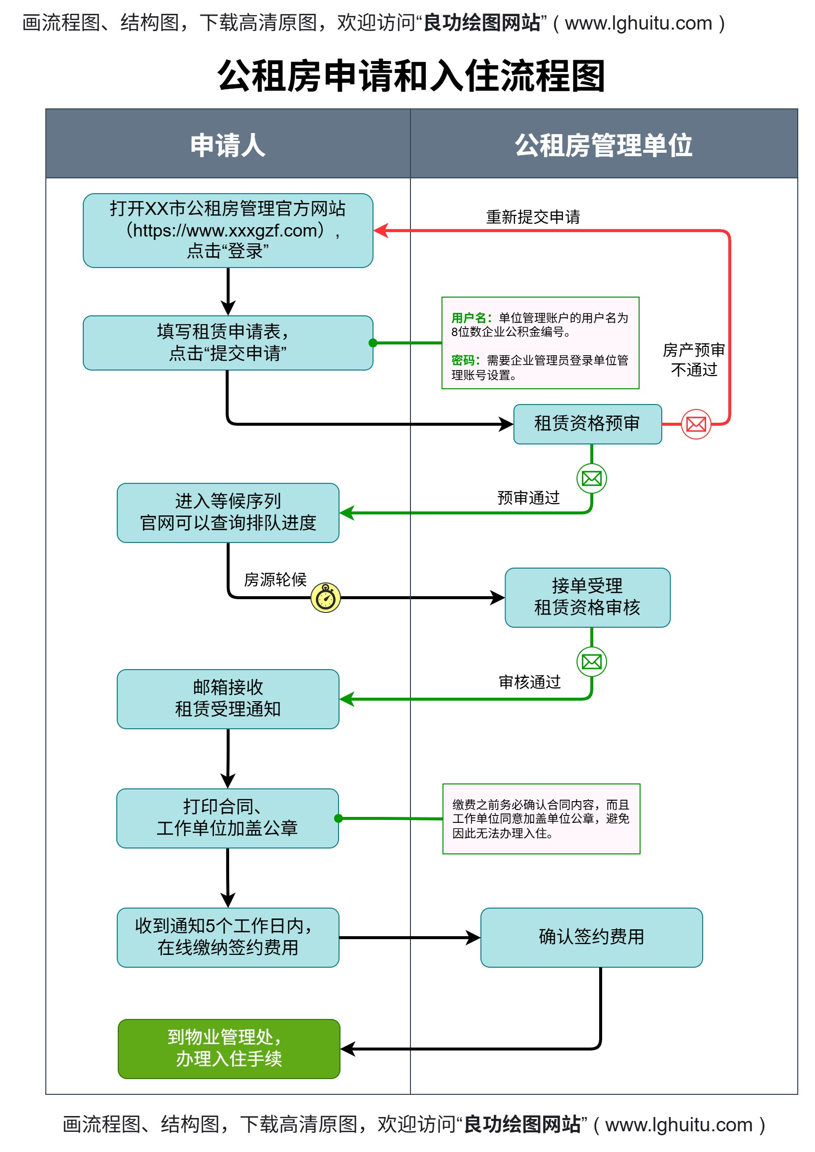 水平泳道图将申请人和管理单位的操作步骤分开呈现,申请人可清晰了解“登录官网”“填写申请表”“缴纳签约费用”等自己需要完成的环节,管理单位可明确“房产预审”“资格审核”“发送通知”等审核职责;流程中的时间节点(如“5个工作日内缴纳费用”)和注意事项(如“合同需加盖单位公章”)在泳道图中标注,减少了申请人因流程不清晰导致的材料遗漏或逾期,提高了入住办理效率。