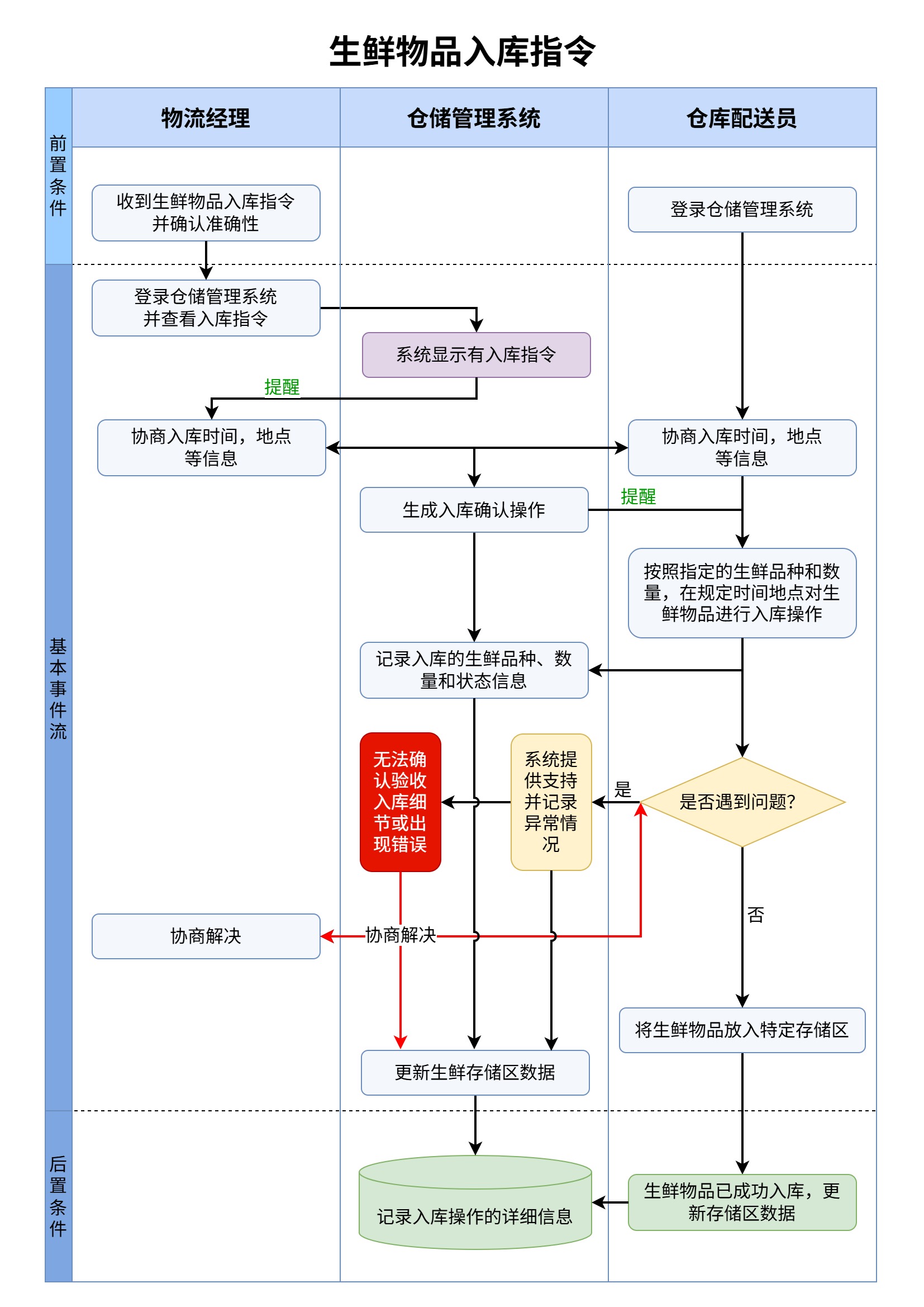 全面列出流程涉及的所有参与主体,包括内部部门、岗位、外部合作方等,避免遗漏。比如“生鲜物品入库流程”涉及的主体有“物流经理”“仓储管理系统”“仓库配送员”;“油气勘探阶段主工作流程”涉及“勘探事业部”“勘探研究院”“工程项目部”“钻探公司”“开发事业部”。主体梳理完成后,按流程参与的逻辑顺序排列泳道,通常将发起方或核心责任方放在最左侧泳道。