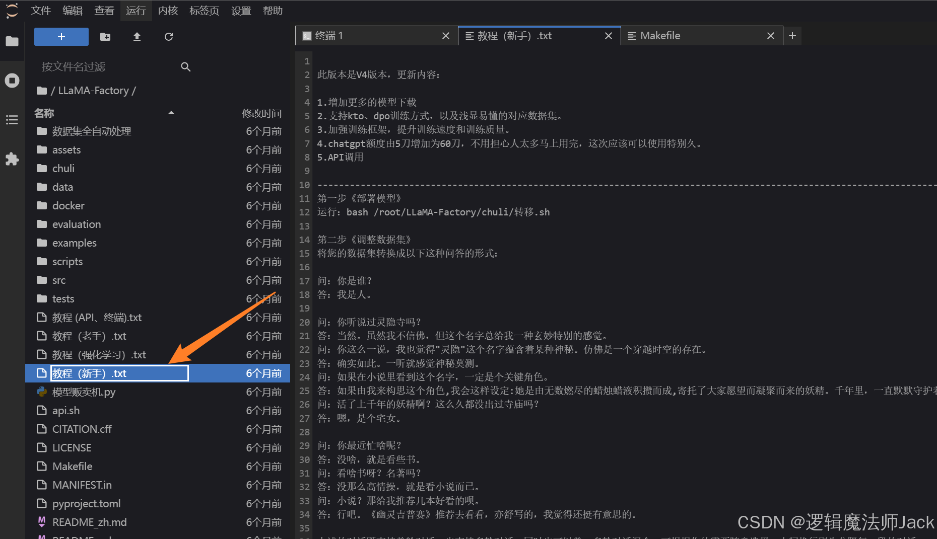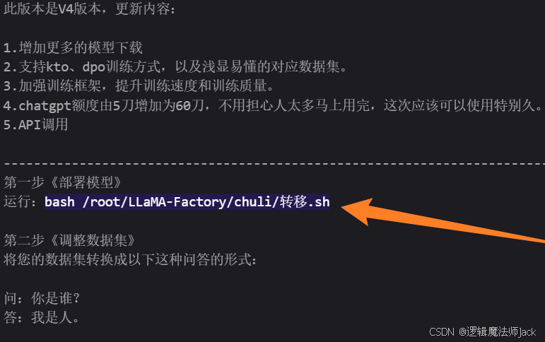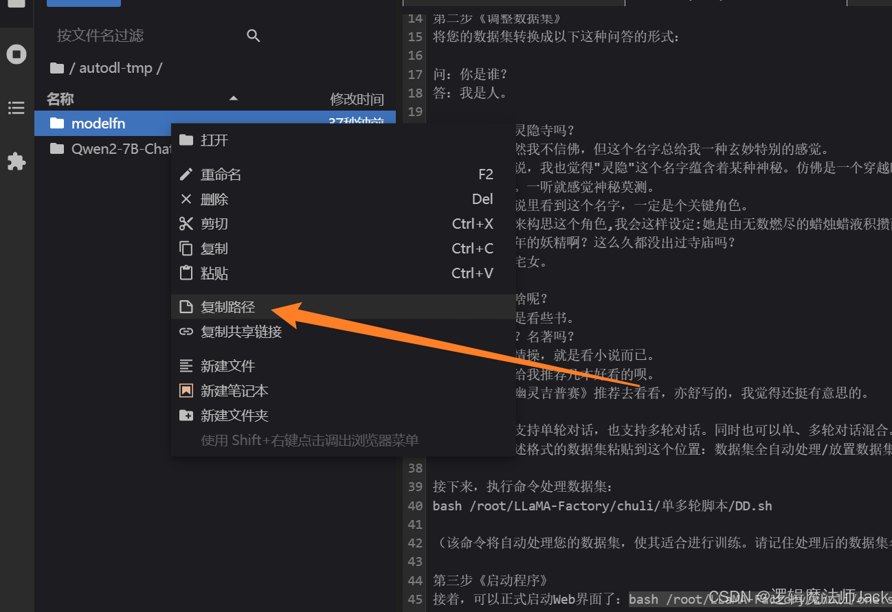 ①回到新手文本文件,复制如下命令:bash /root/LLaMA-Factory/chuli/one.sh。