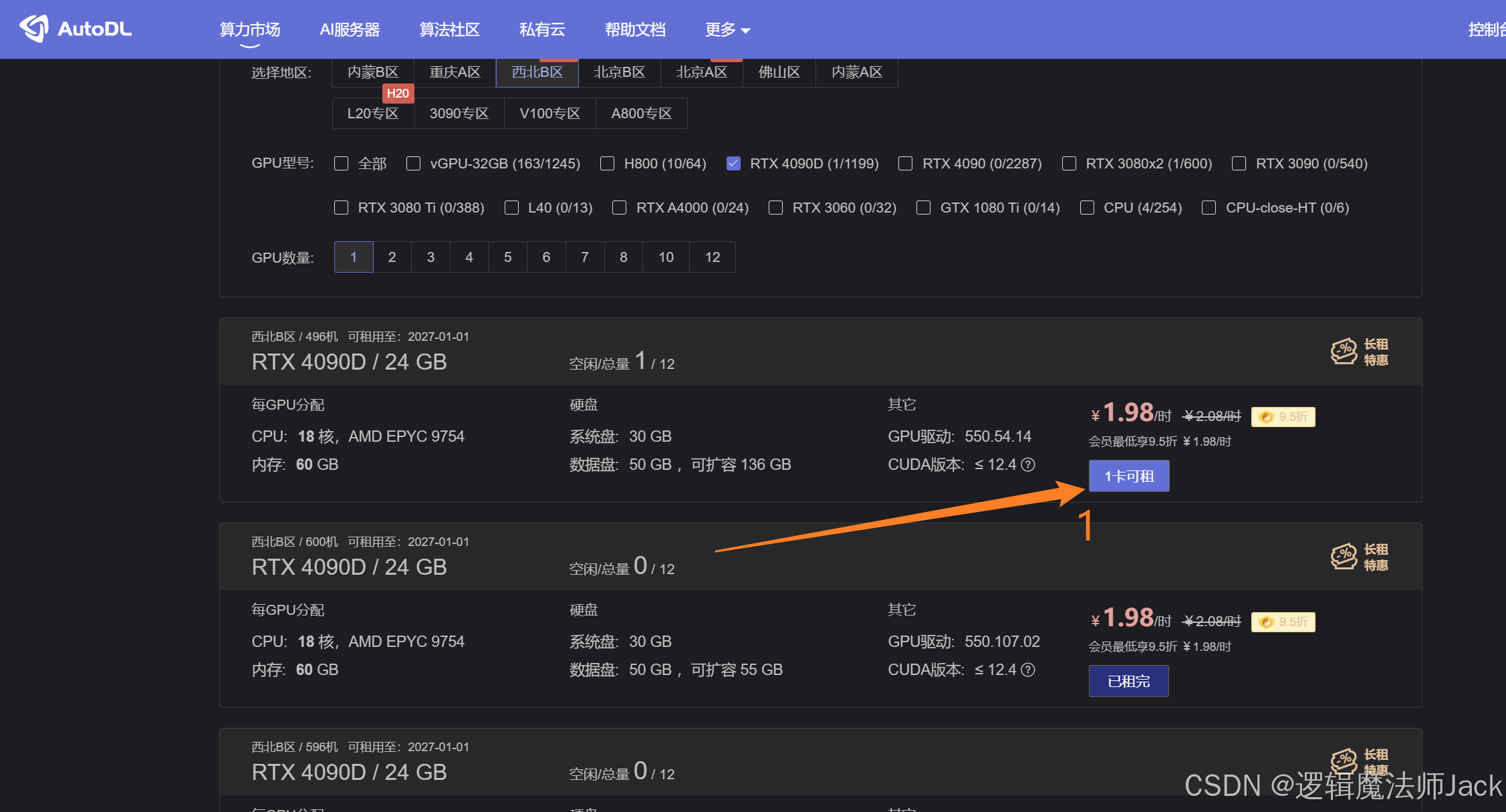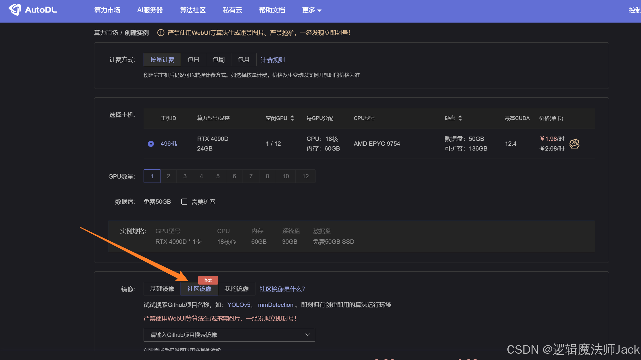 2.2、租赁RTX4090(24G)服务器与社区镜像选择
