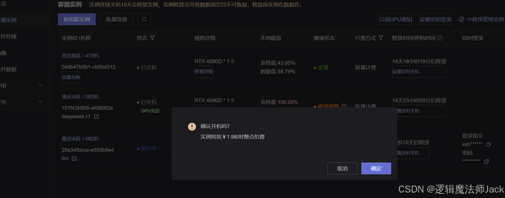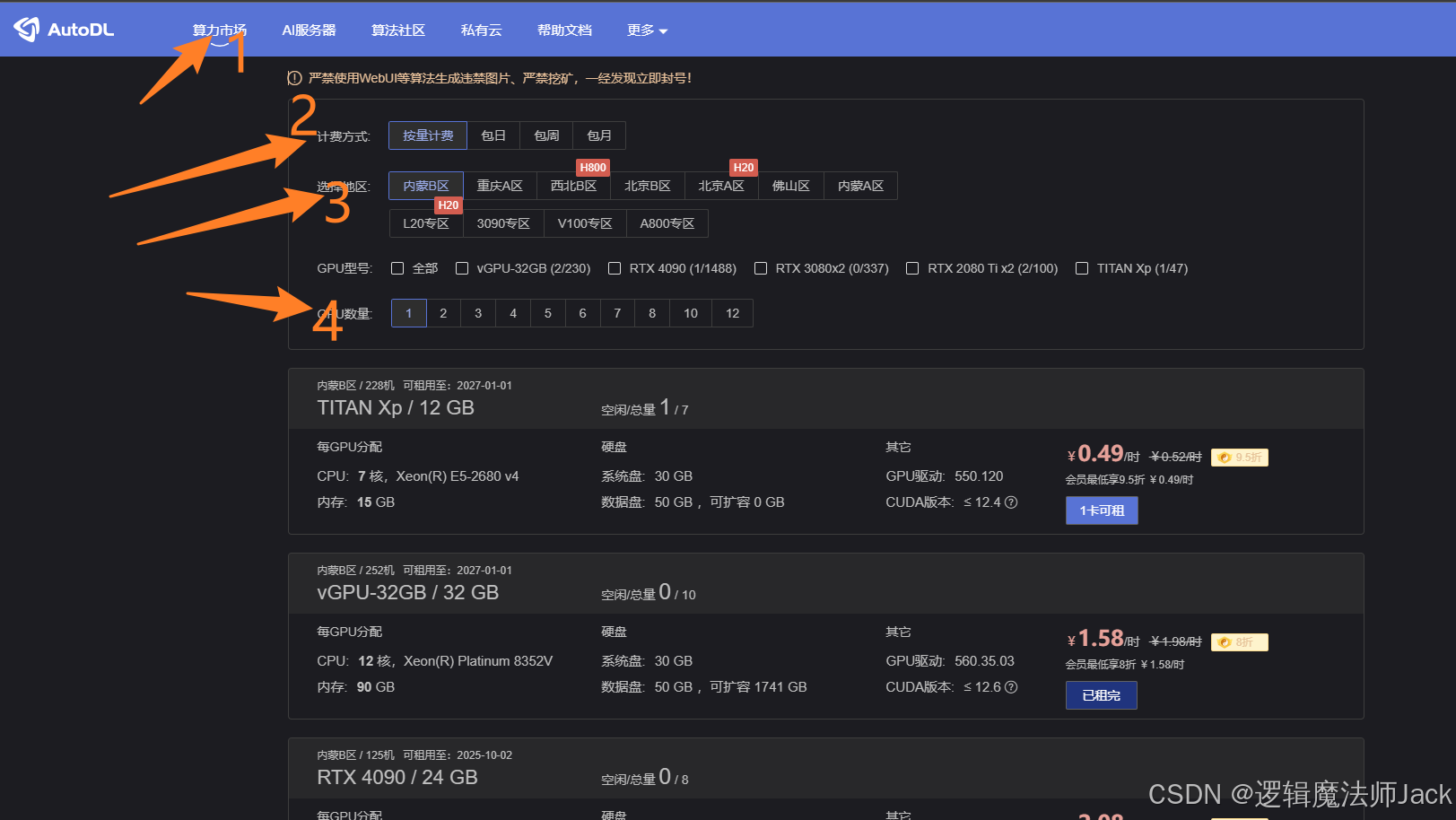 ③GPU型号:根据自己需求选择,一般选择中等配置4090或者3090(配置太高,费用太贵;配置太低,效果不佳)。