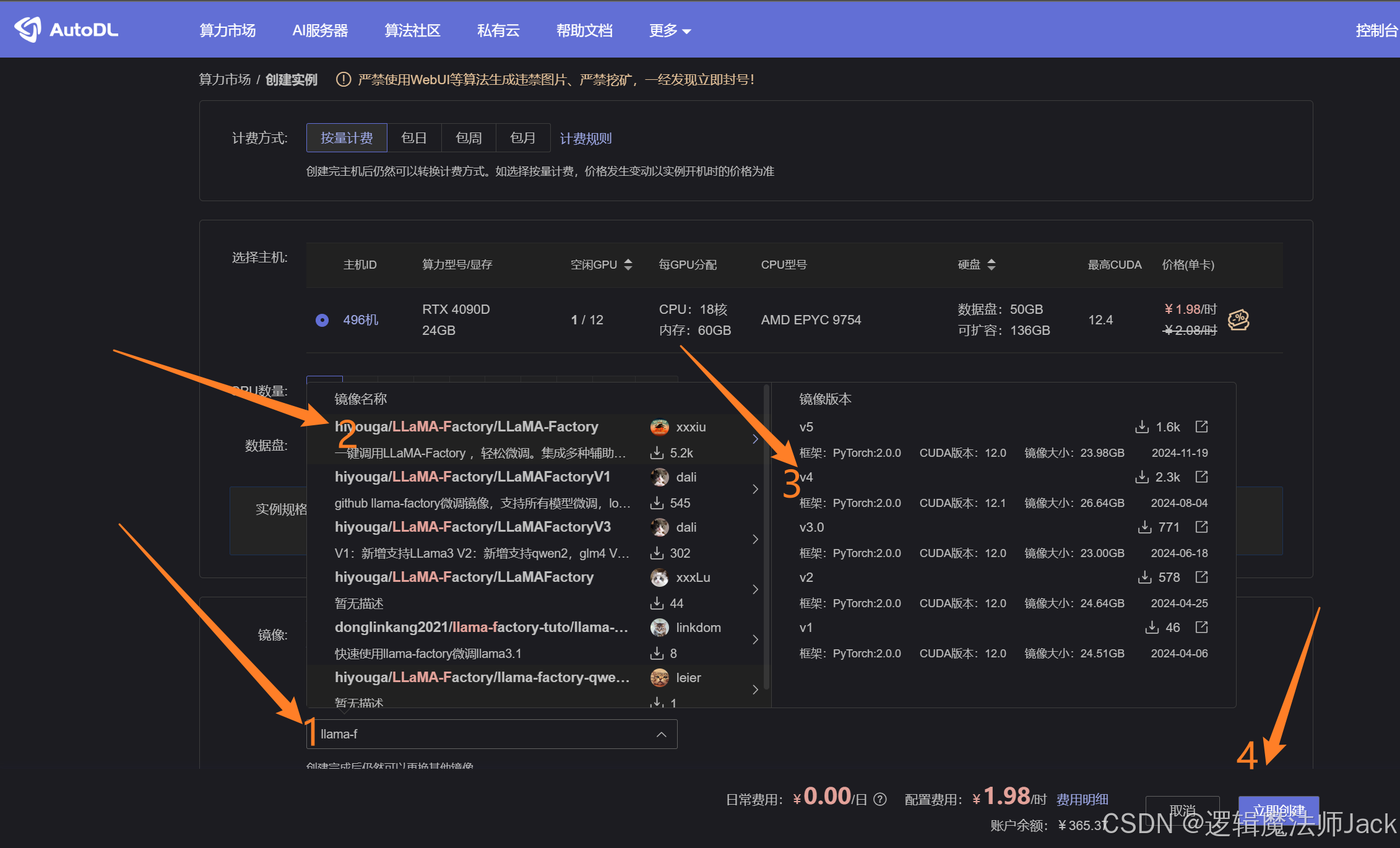 ③按图所示步骤搜索社区镜像LLaMA-Factory,按照步骤依次选择镜像和版本V4,点击立即创建。