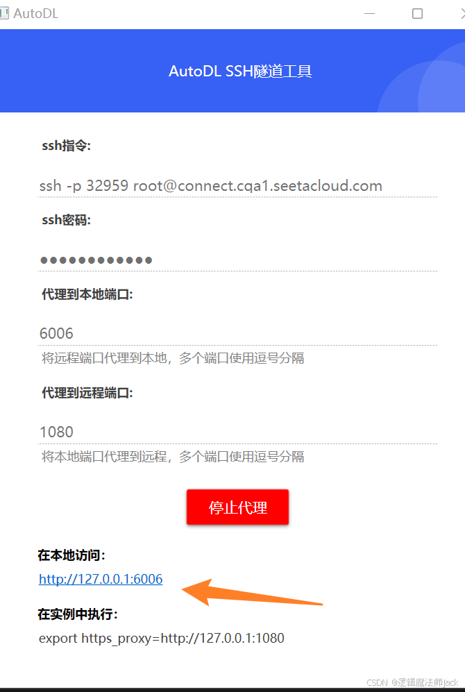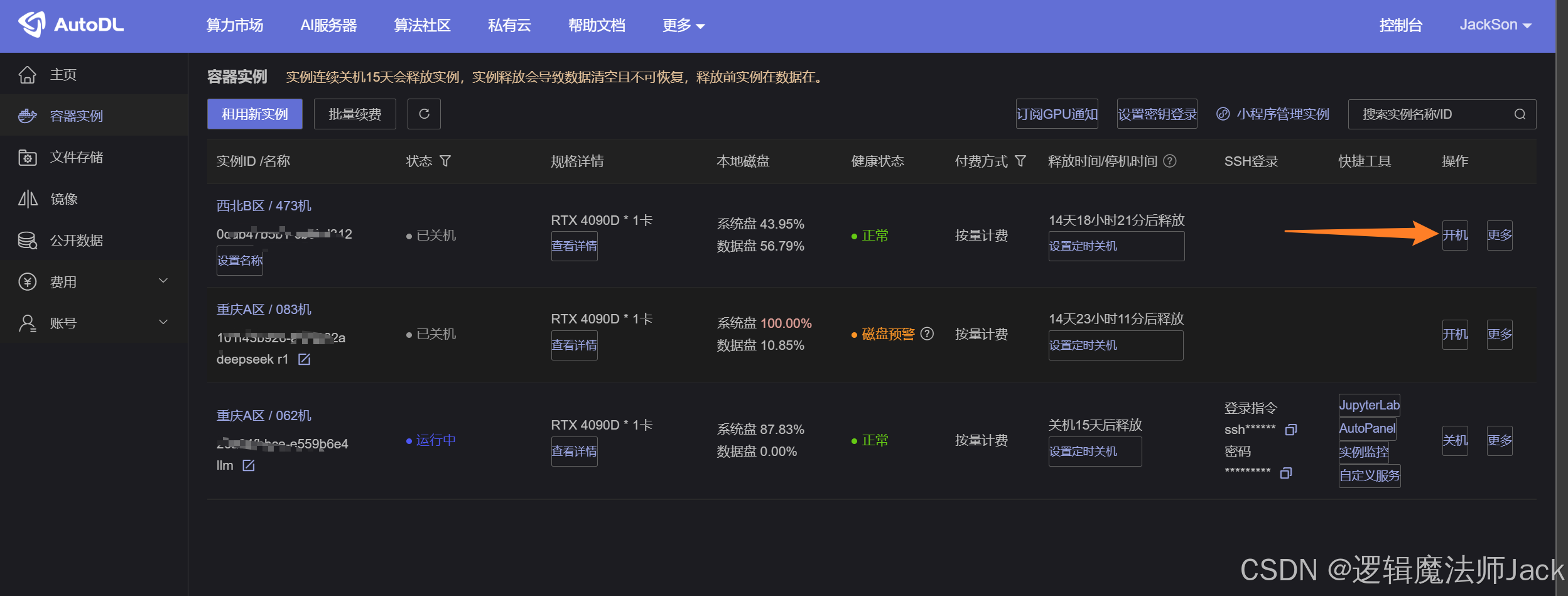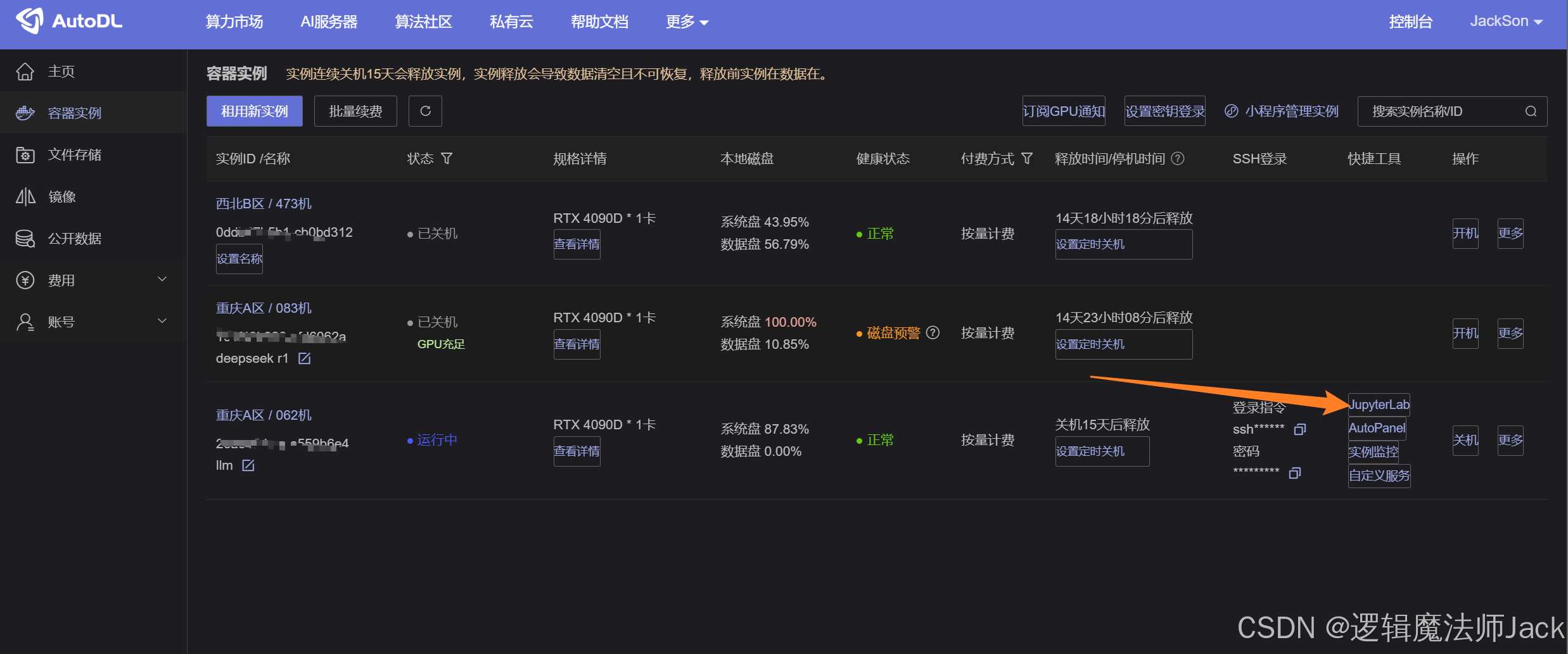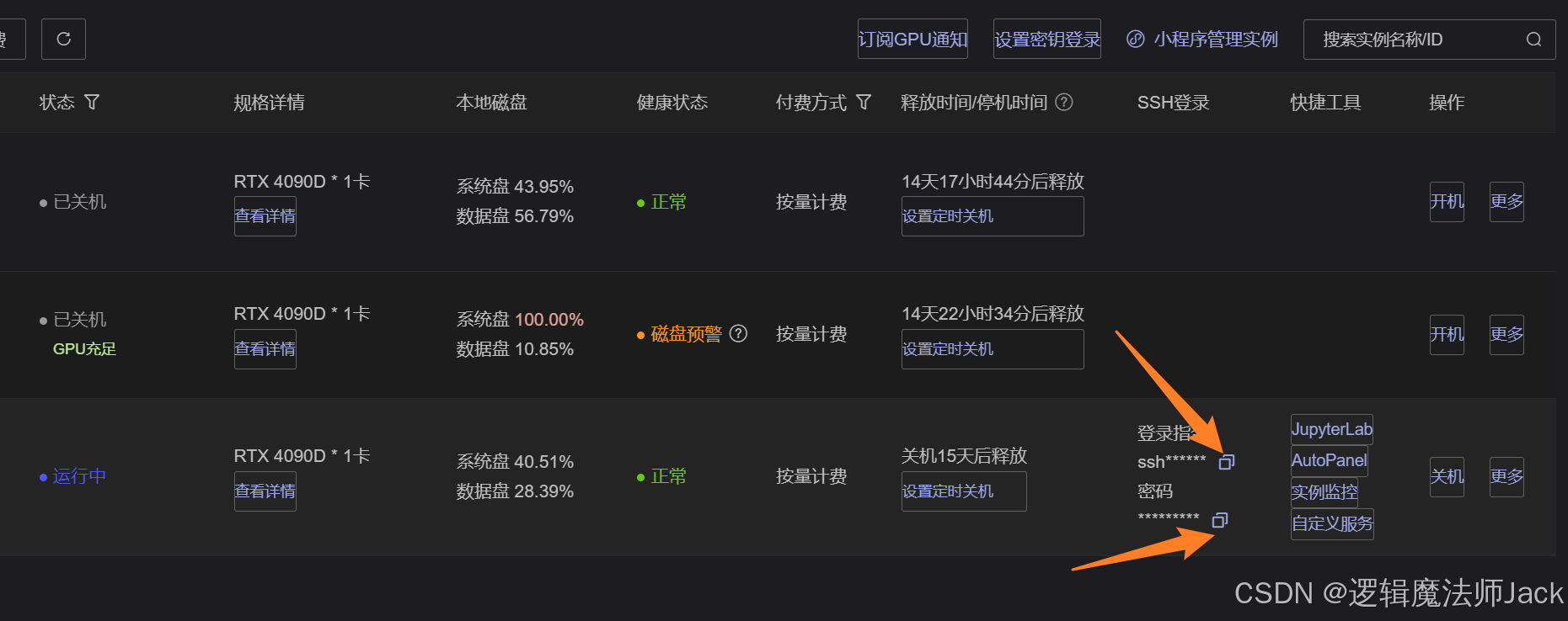 ②返回AutoDL网站主页,复制SSH指令和密码。