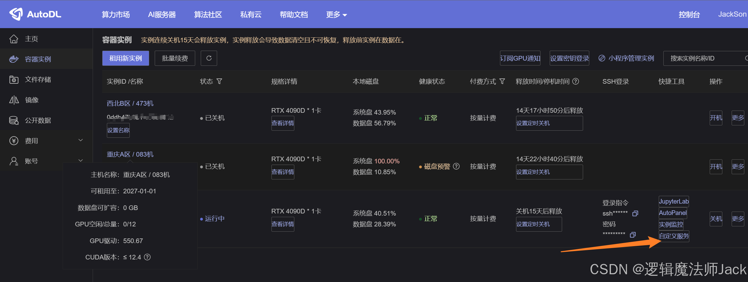 ①返回AutoDL主页,选择刚才开机服务器,点击自定义服务。