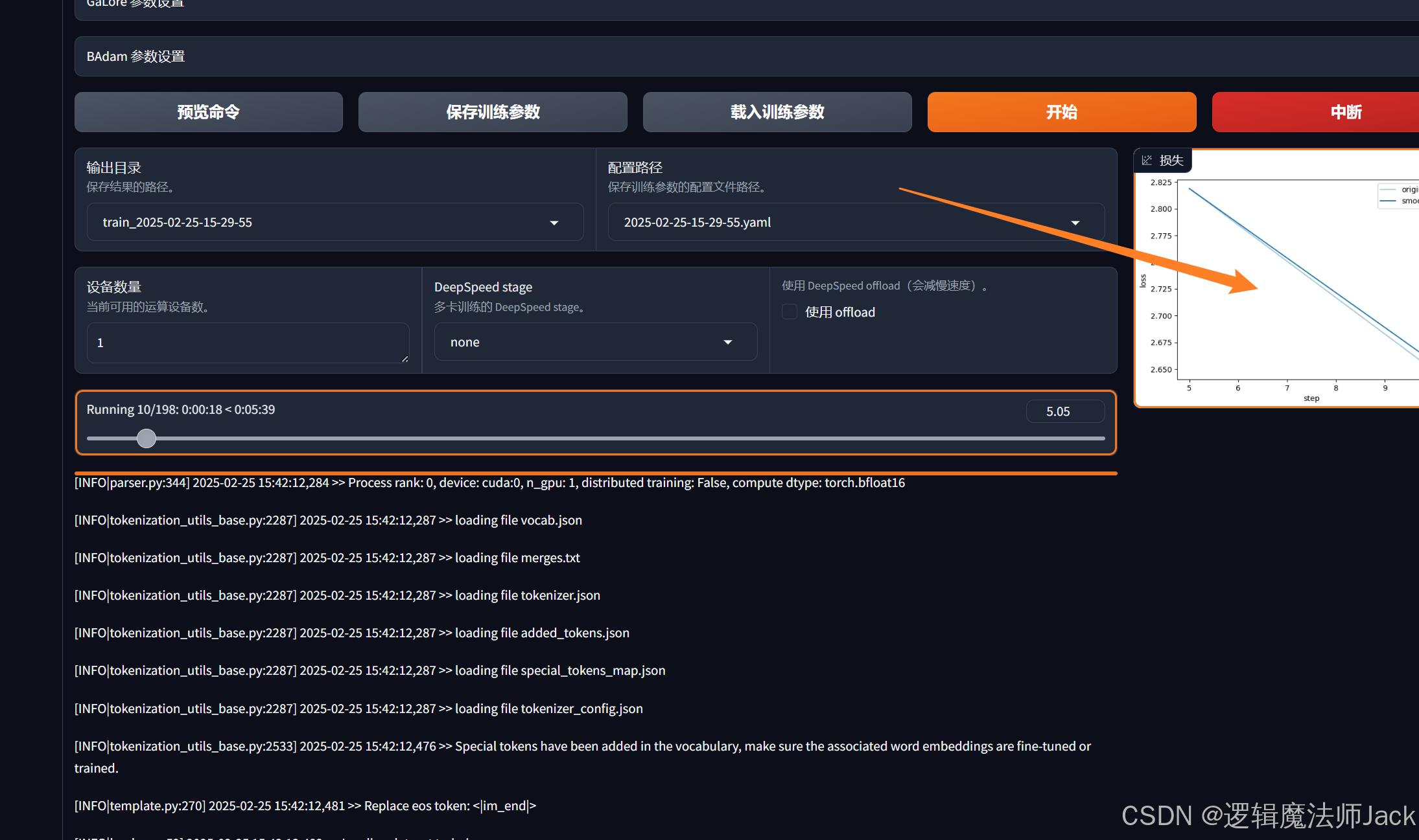 ②点击开始:模型开始微调训练(时间较长,请耐心等待进度条跑完)。