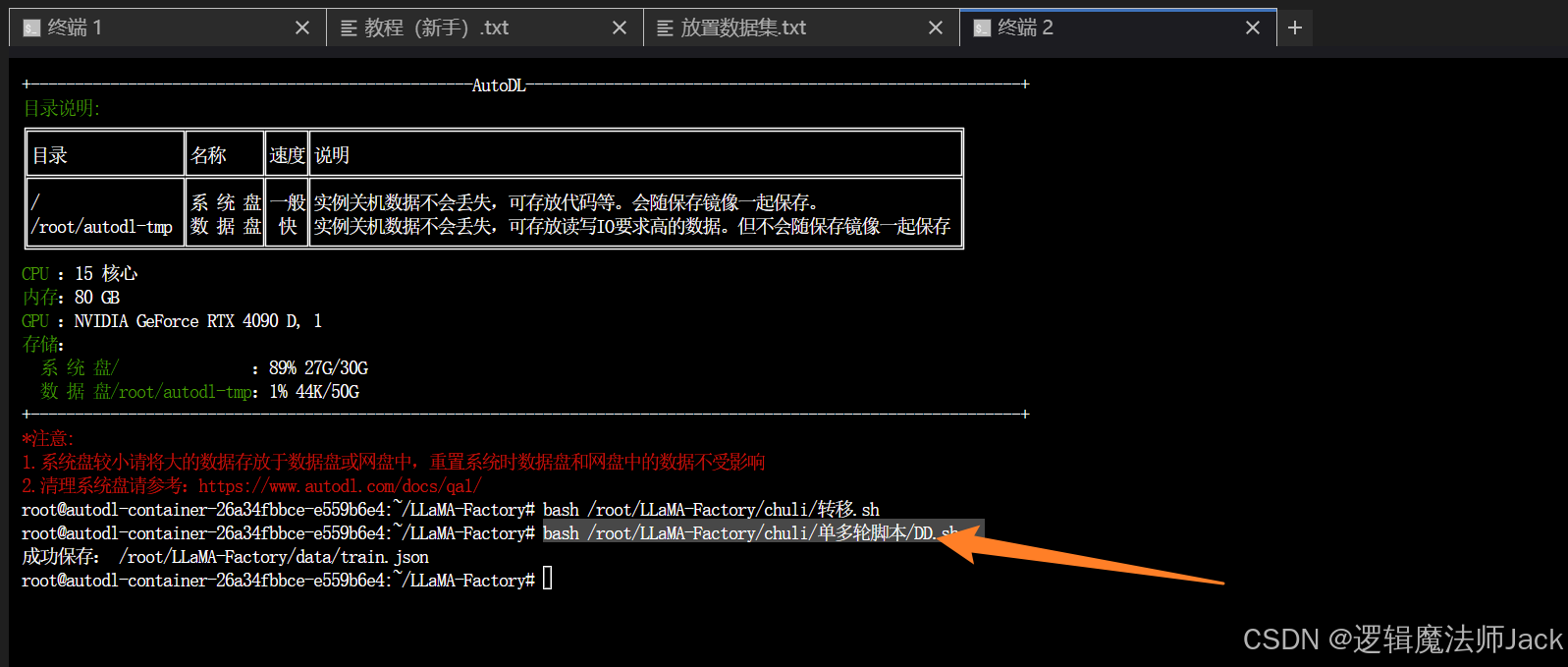 ①回到新手文本文件,复制如下命令:bash /root/LLaMA-Factory/chuli/单多轮脚本/DD.sh。