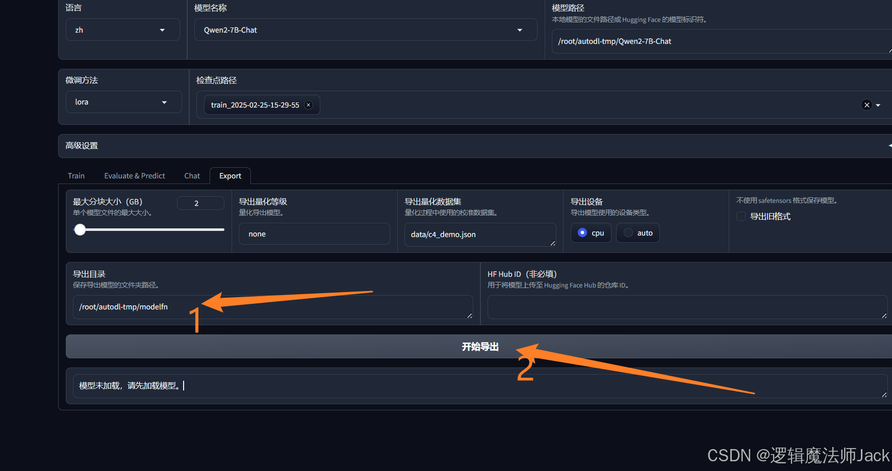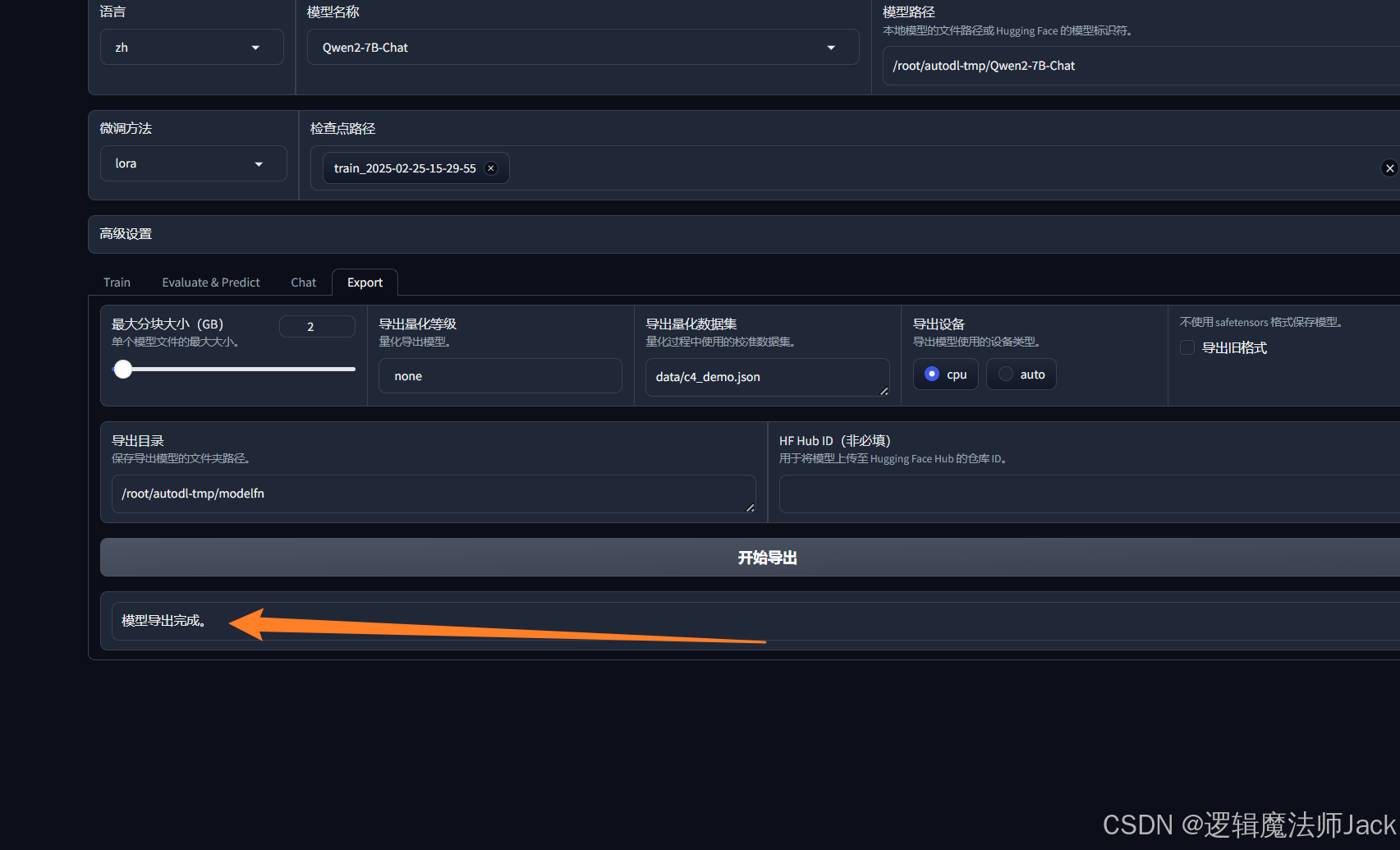 ④返回微调的控制台:输入/root/autodl-tmp/modelfn,点击开始导出,进行模型导出。