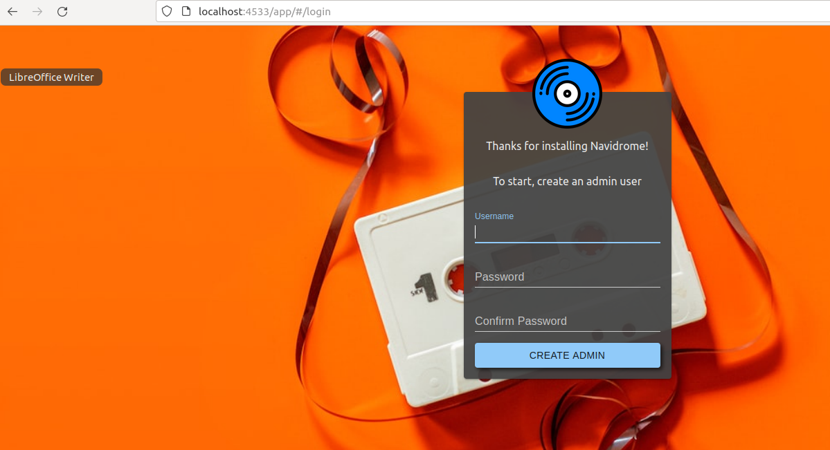 启动成功后,在浏览器中输入 localhost:4533,可以看到进入到了 Navidrome 的登录界面,需要设置一个用户名和密码。