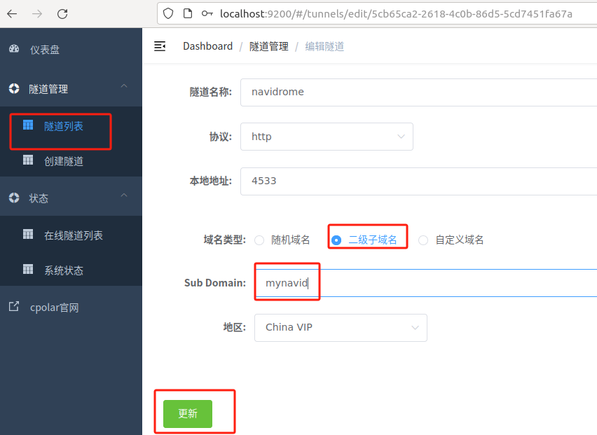 - 隧道名称:可自定义,本例使用了:navidrome 注意不要与已有的隧道名称重复