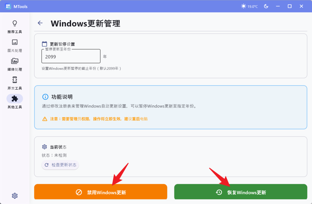 用得比较多的是禁止更新,可自行设置禁止更新天数,然后一键禁止。想要恢复也非常简单,只要点击【恢复Windows更新】即可。