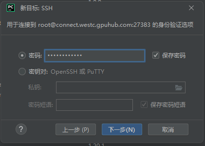 回到autodl中复制密码,并填入pycharm的弹窗中,点击【下一步】→【下一步】