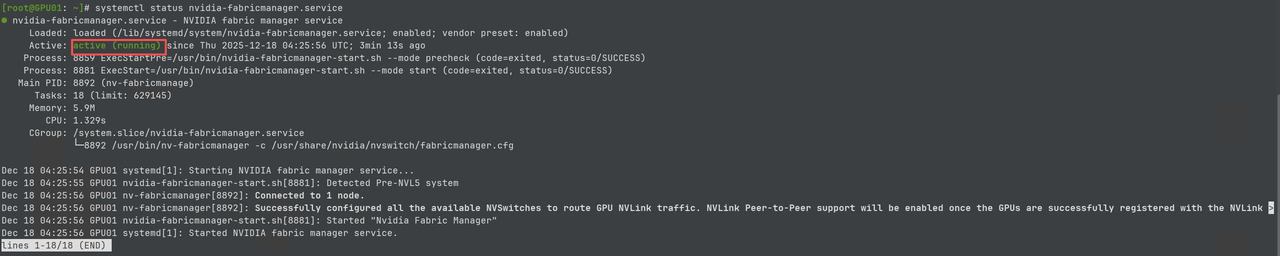 # 执行如下命令查看Fabric Manager服务是否正常启动,回显active(running)表示启动成功。