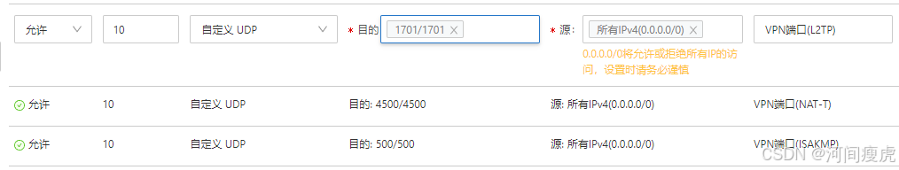 500(ISAKMP)和4500(NAT-T),以及1701(L2TP)等。 - 授权对象:可以选择“0.0.0.0/0”表示允许所有 IP 访问,或限制为特定的 IP 段。