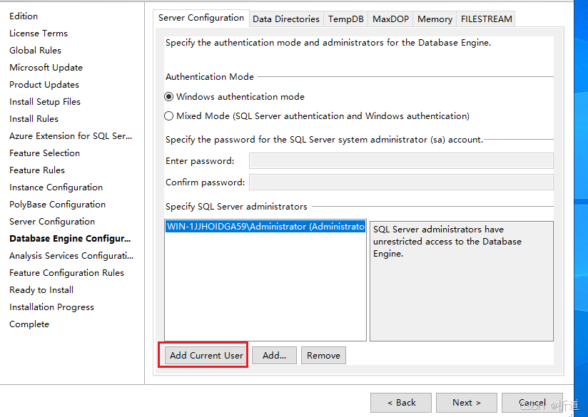 这里可以配置SQL Server的管理员用户,我们至少要添加当前用户,点击Add Current User就行。在企业环境中,不建议直接启用sa用户。