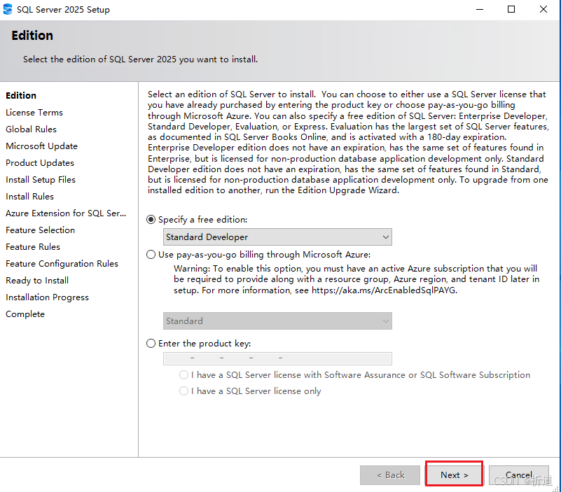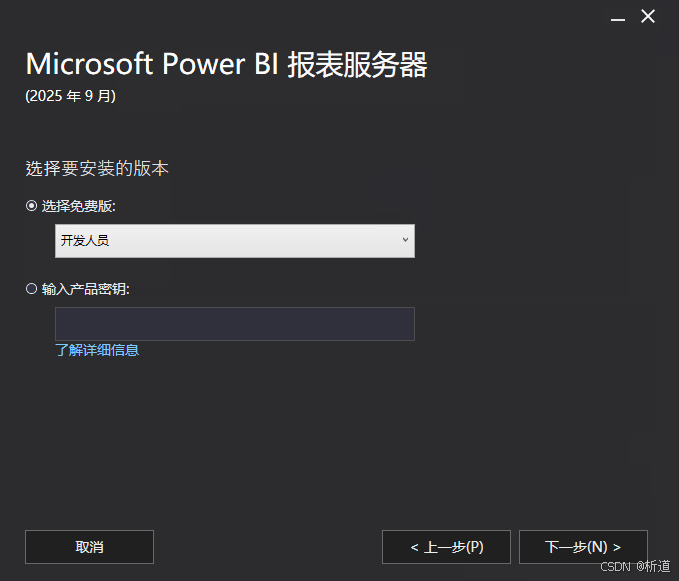 如果在前面提到的渠道中获得了产品密钥,可以在此时进行填入,如果没有,我们选择开发人员:
