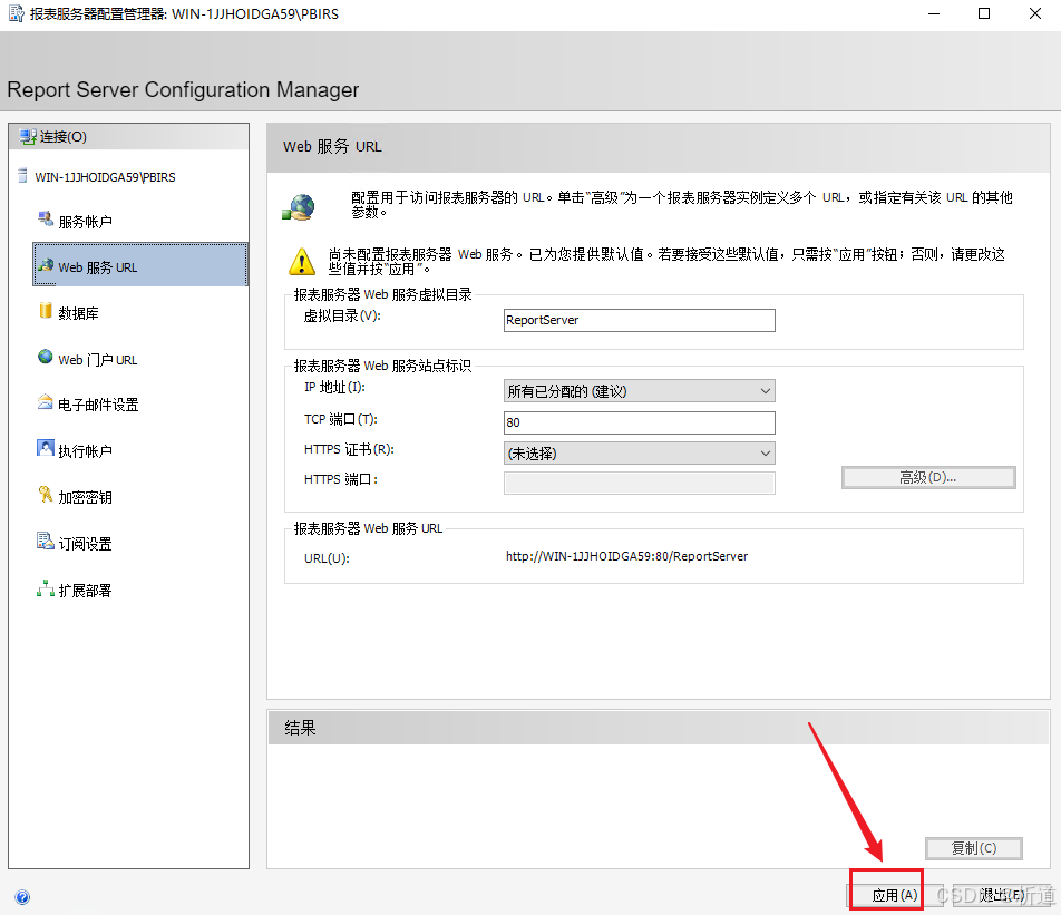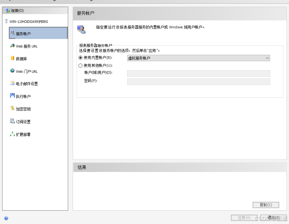 服务账户(指的是运行报表服务器的账户),默认是虚拟服务账户(最小权限),如果需要连接到另一台计算的SQL Server应该选择网络服务,然后点击应用即可: