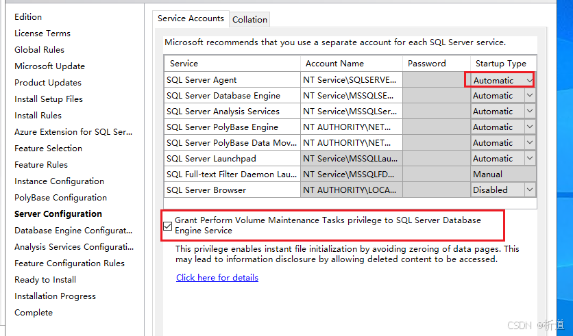 Server Configuration这里我们把SQL Server Agent改为自动,这样会随着服务器的启动而启动