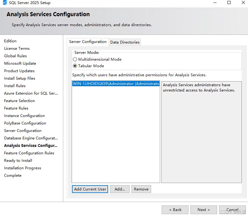 Analysis Services这里同样添加当前用户,AS模式依据实际情况选择,我选择的是tabular: