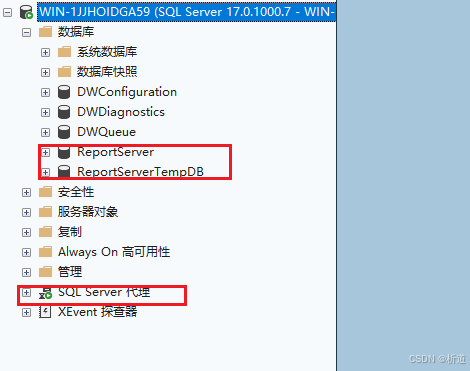 在这我们可以管理我们的报表服务器数据库,确保SQL Server代理开启,如果按照我的教程来配置,那么它是默认开启的: