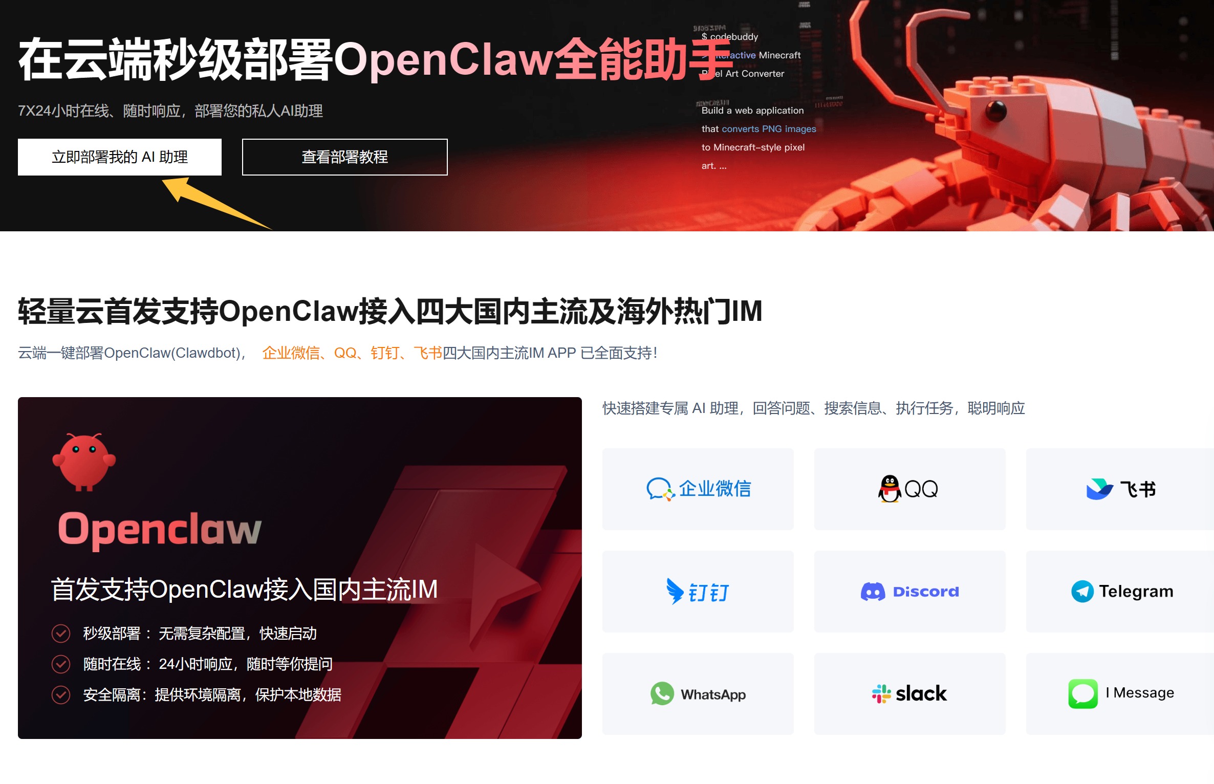 第一时间支持了 OpenClaw,并且可以接入国内的聊天软件: