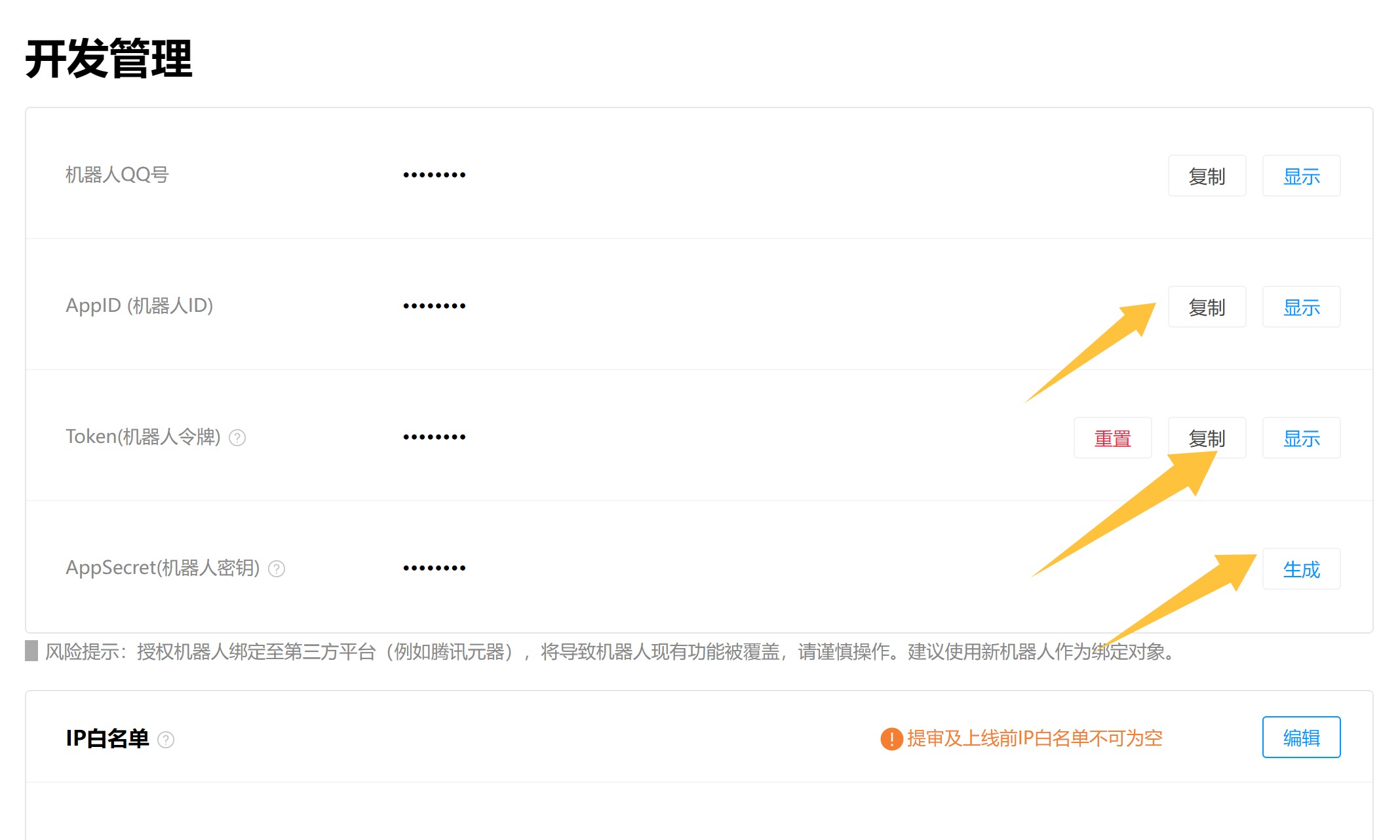 这里主要用到了 QQ 机器人的编号 ID 和机器人的密钥 Secret。我们在上一步中都已经获取了。