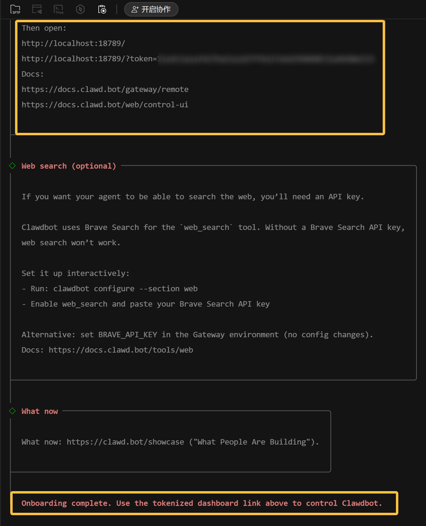 稍等一下,就会跳出上面的内容。当看到“Onboarding complete”就证明配置已经完成了!