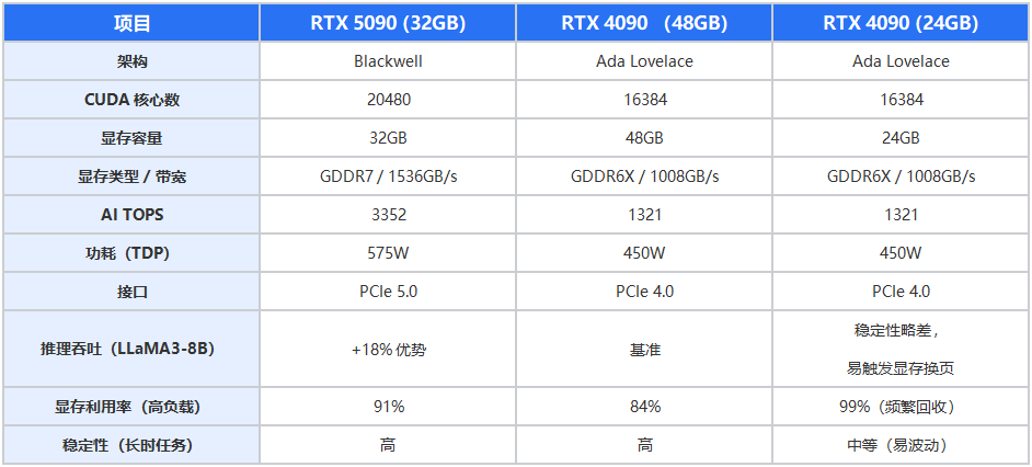 ●32GB的RTX 5090在带宽与能效上具备显著优势,适合模型推理、参数微调及高并发多实例部署。