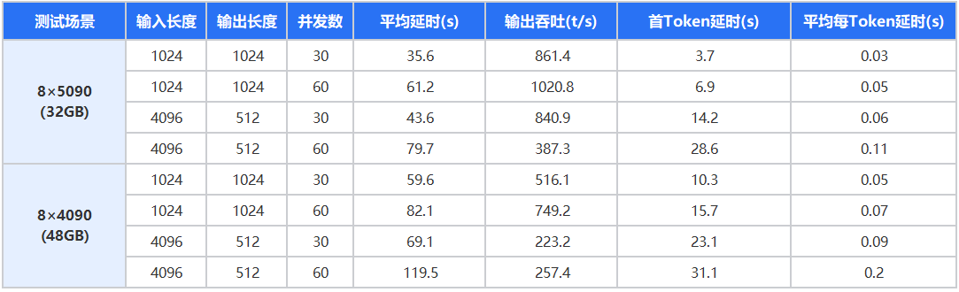 ●在中等输入长度(1024 tokens)与高并发(60线程)下,5090整机平均延时较48G版4090低 28.6%,吞吐提升 约36.3%。