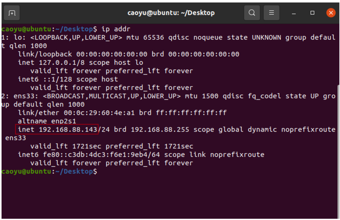 • 然后输入命令: ip addr 可以看到虚拟机的IP地址,如下图