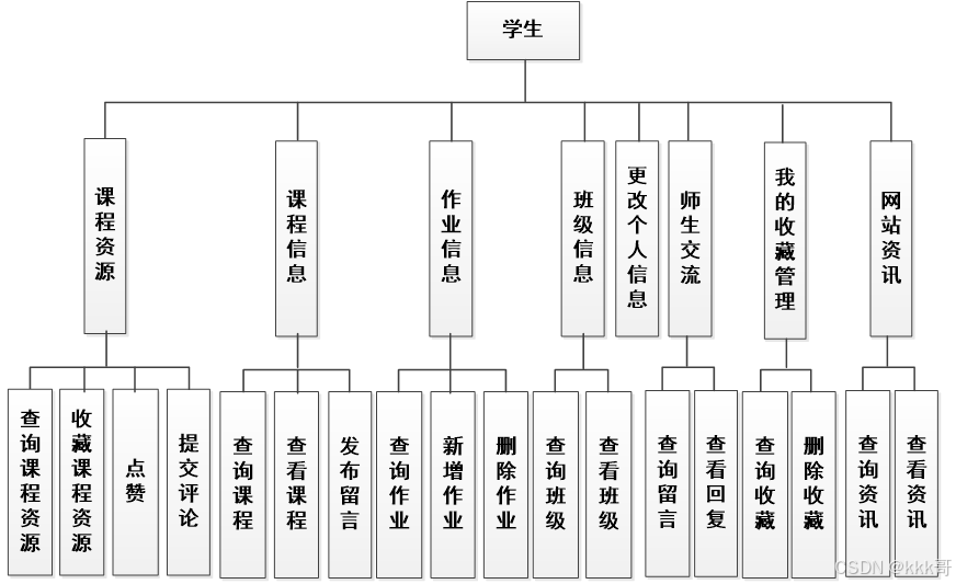 在前面分析的学生功能的基础上,进行接下来的设计工作,最终展示设计的学生结构图(见下图)。学生新增作业,查看作业审核信息,收藏或评论课程资源,查看班级和课程。