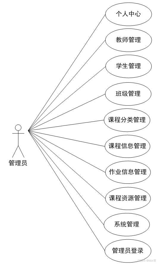 基于微信小程序的移动学习平台经过分析,确定了其需要设置管理员的角色,其操作的功能通过用例图展示(见下图)。管理员对教师,课程分类,班级,课程,学生信息进行管理,审核学生作业,管理课程资源。