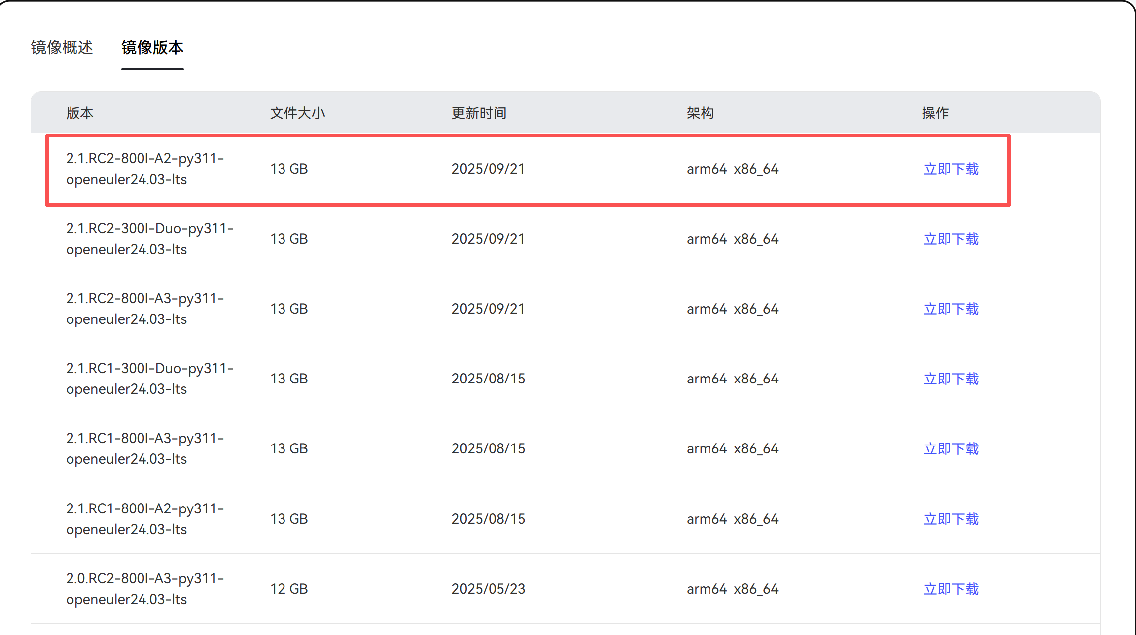 选择所需镜像,点击“立即下载”(1.0.0及以后版本支持DeepSeekR1蒸馏模型):