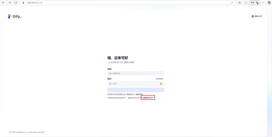 在浏览器内输入“本机ip:端口号”该端口号为在启动dify时更改的NGINX_PORT(见本章节(2)),若无更改,则使用默认的80端口登录。例如:网址:172.16.23.55:80